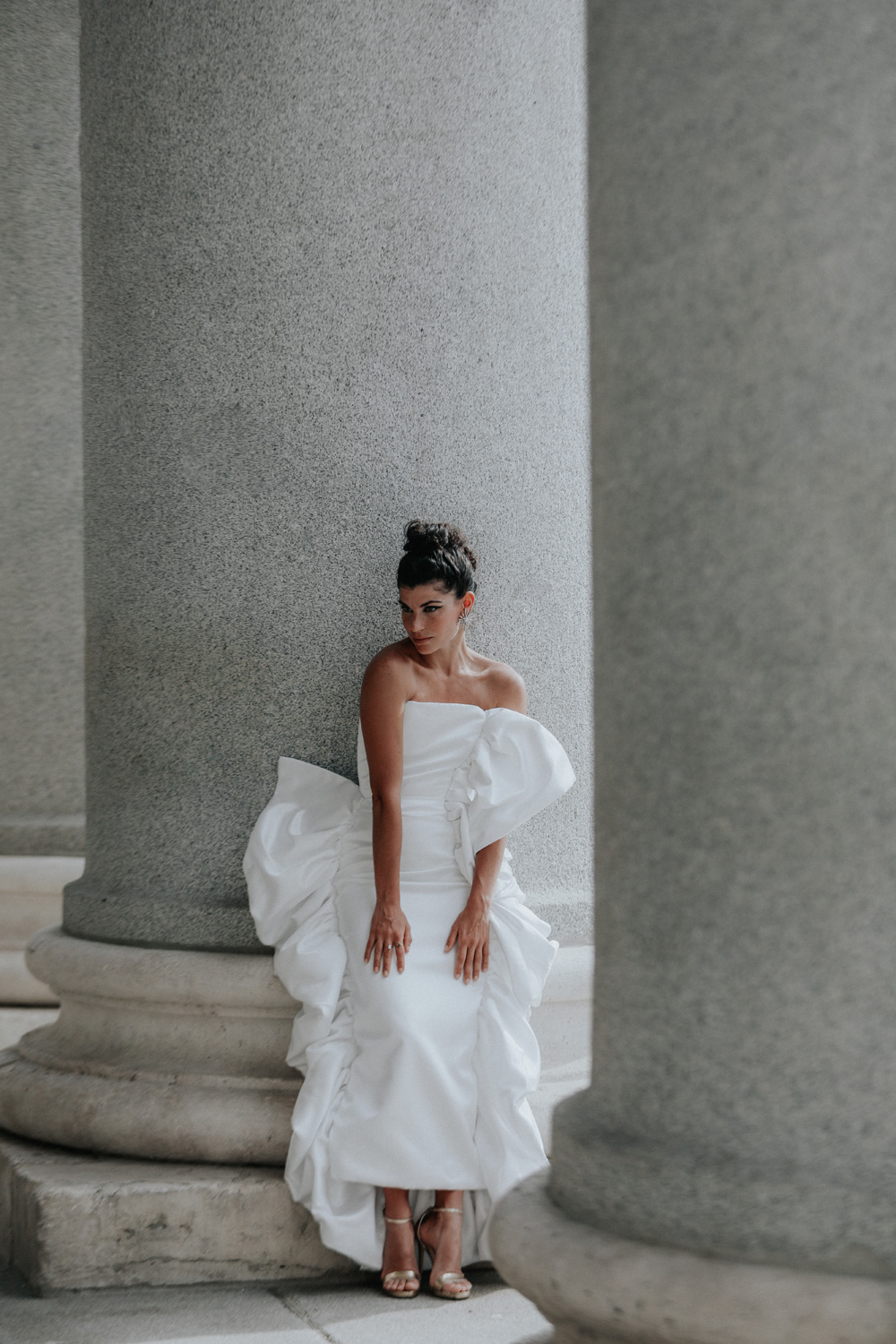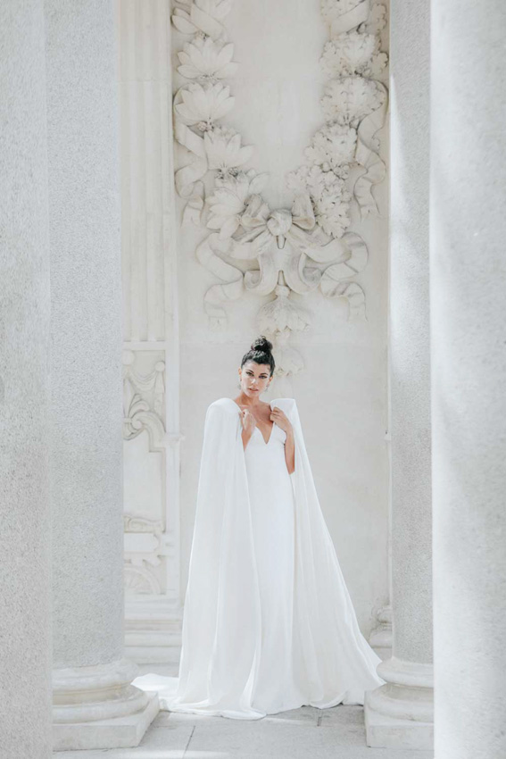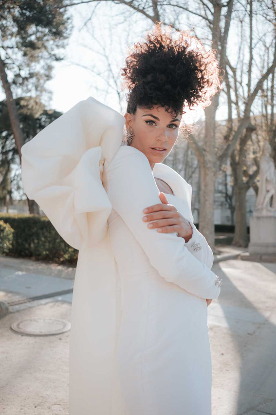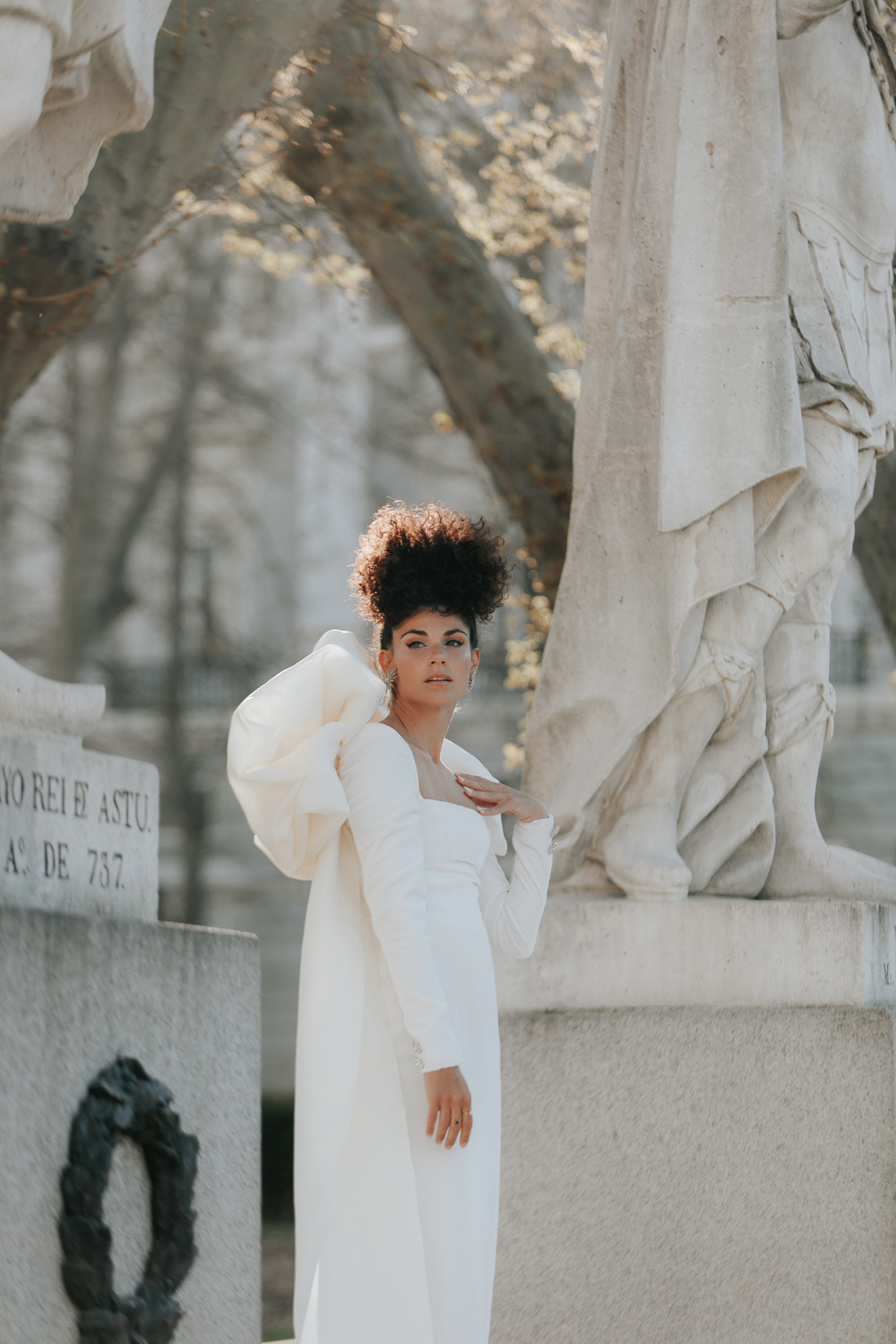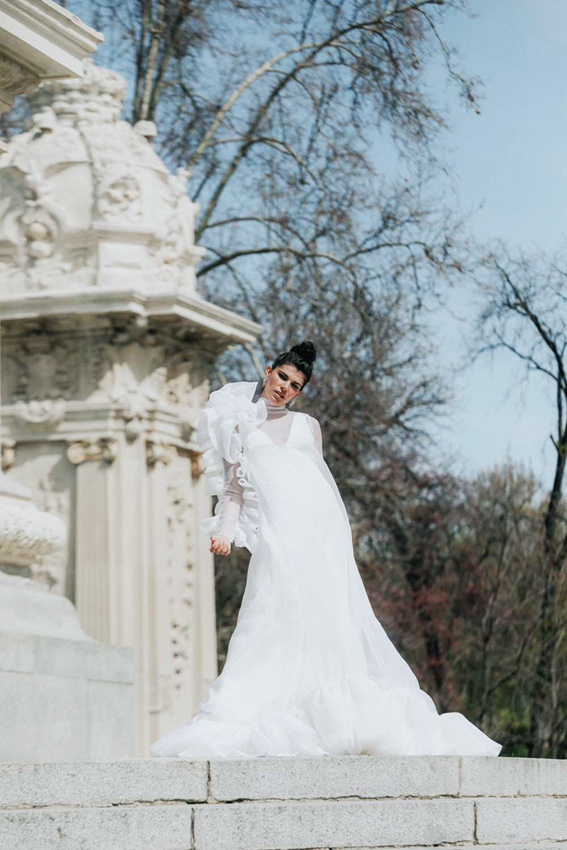 Plumas mecidas por el traqueteo del metro, que nos recuerdan que esta ciudad nunca duerme. Crepes de seda que se enredan en una baile infinito entre las columnatas de El Retiro. Volúmenes esculturales, tweed y organza para vestir a una novia tan rompedora como Madrid. Una mujer que se enfrenta sin miedo a los leones de bronce que decoran la capital, caminando con fuerza por la Gran Vía mientras se siente tan única como obras que cuelgan en el Museo del Prado. Tan canalla como Malasaña. Tan castiza como Chamberí.