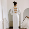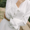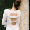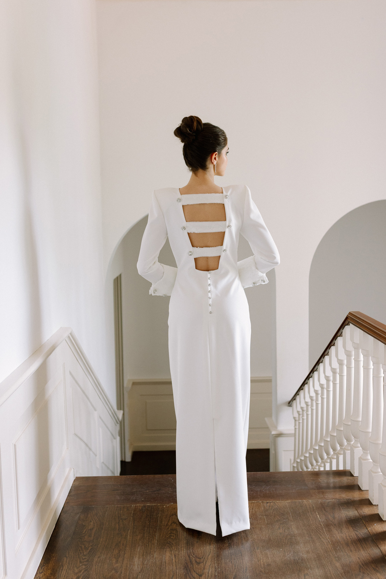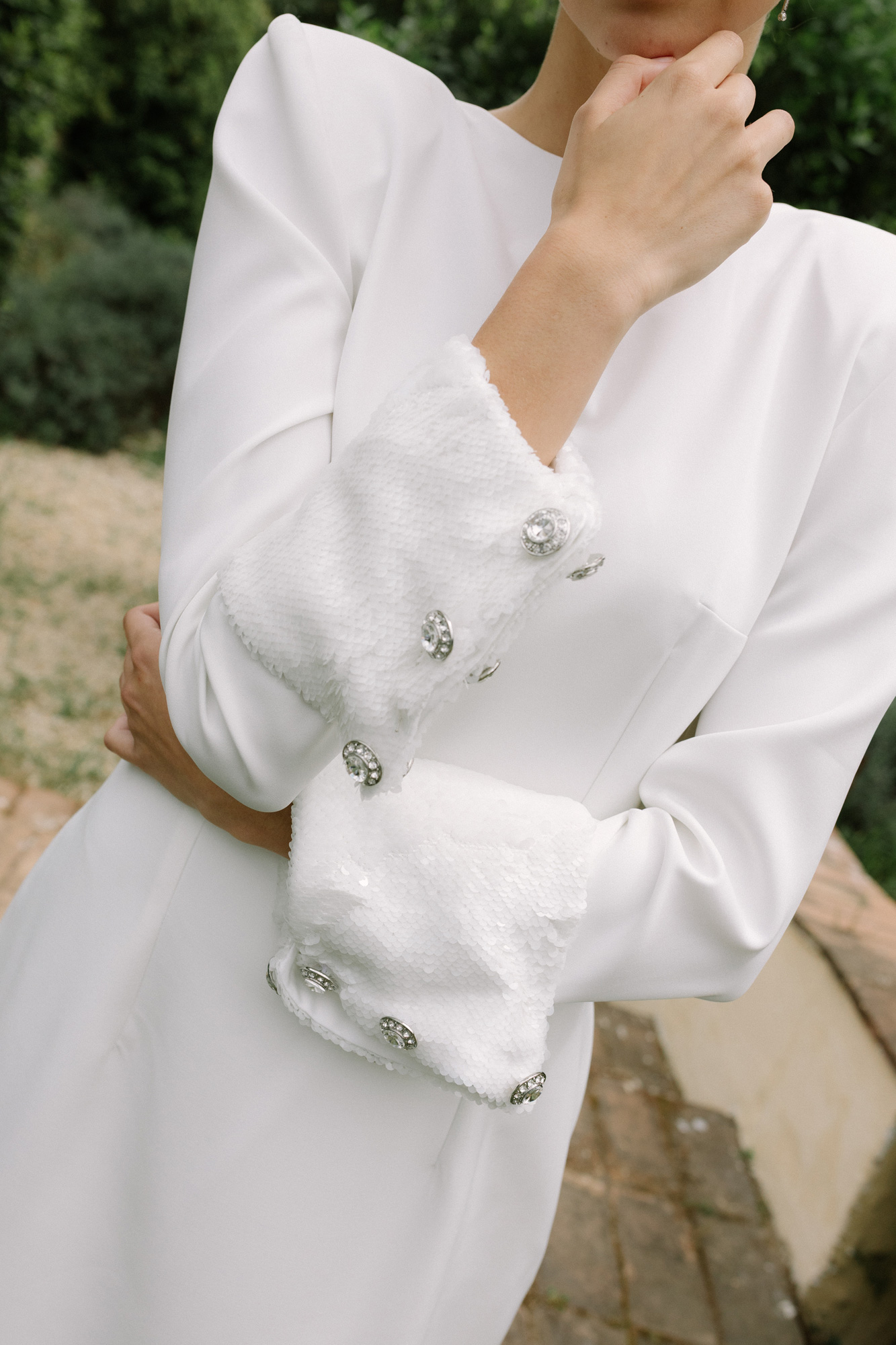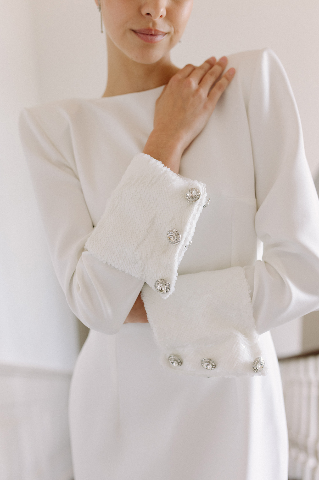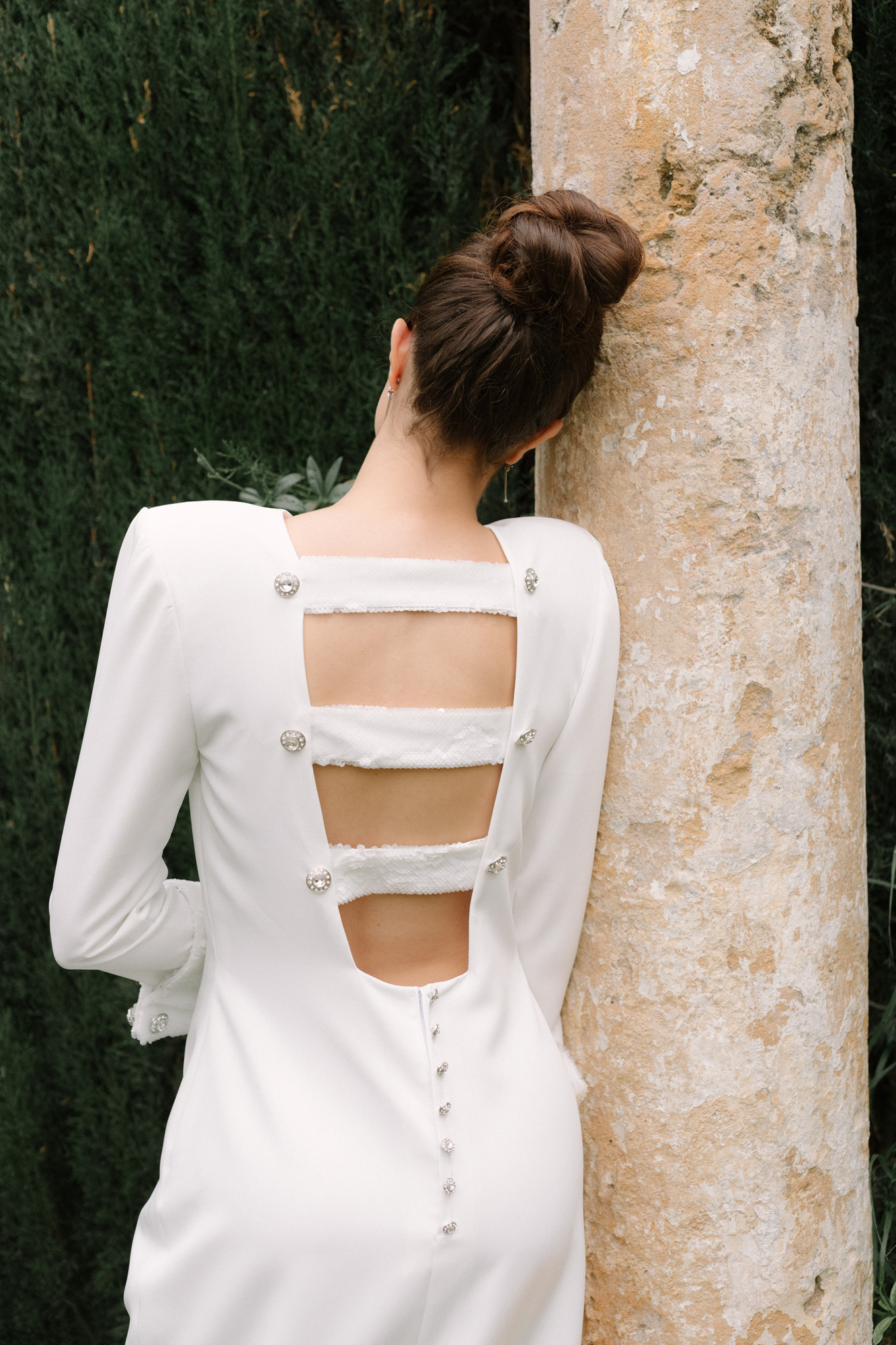 De líneas sobrias y elegantes, la pieza dirige la atención hacia los puños para, posteriormente, descubrir una espalda articulada mediante anclajes que conectan cada instante, dando lugar a nuevos recuerdos.
