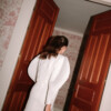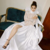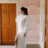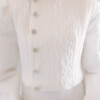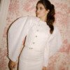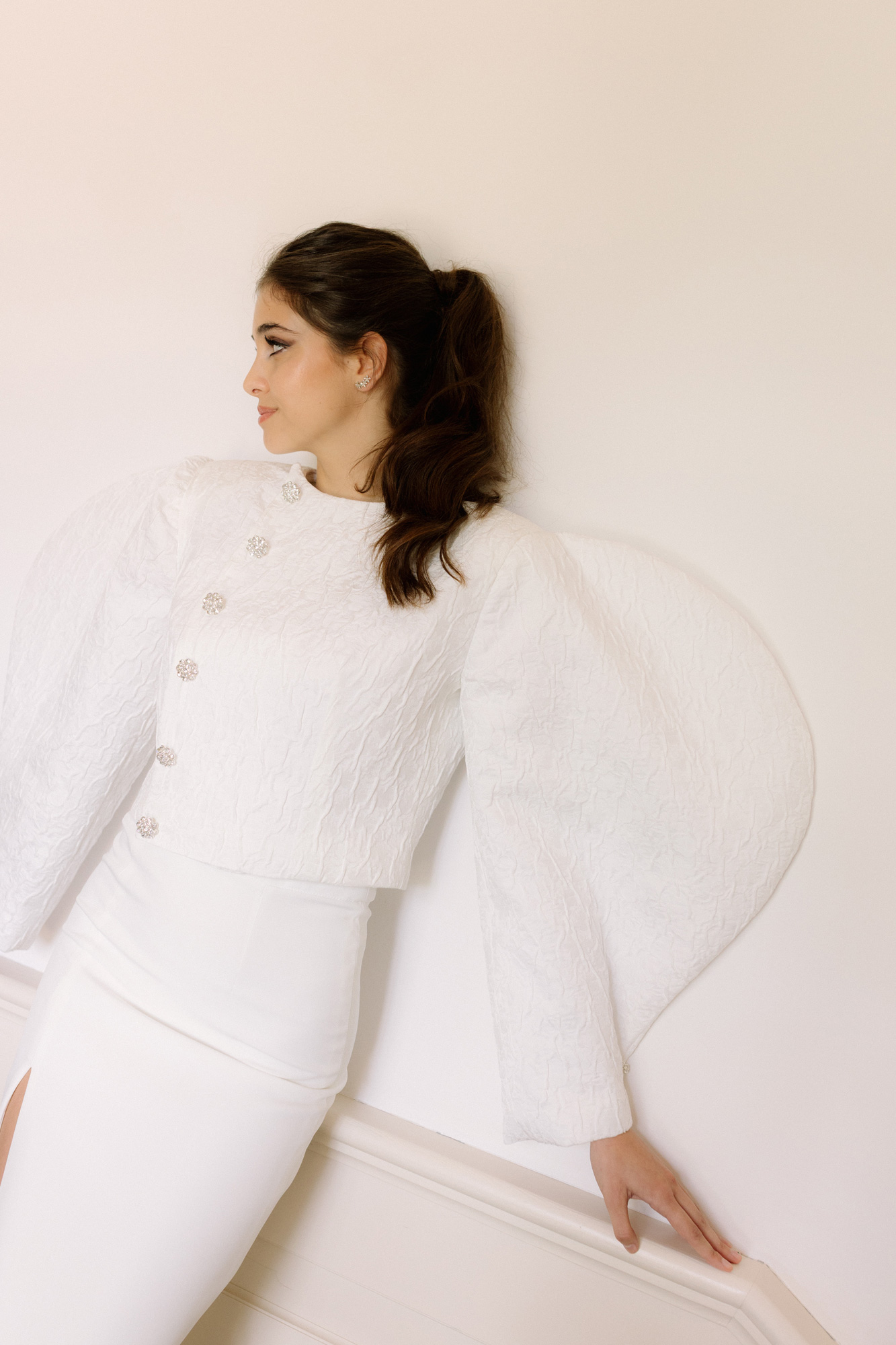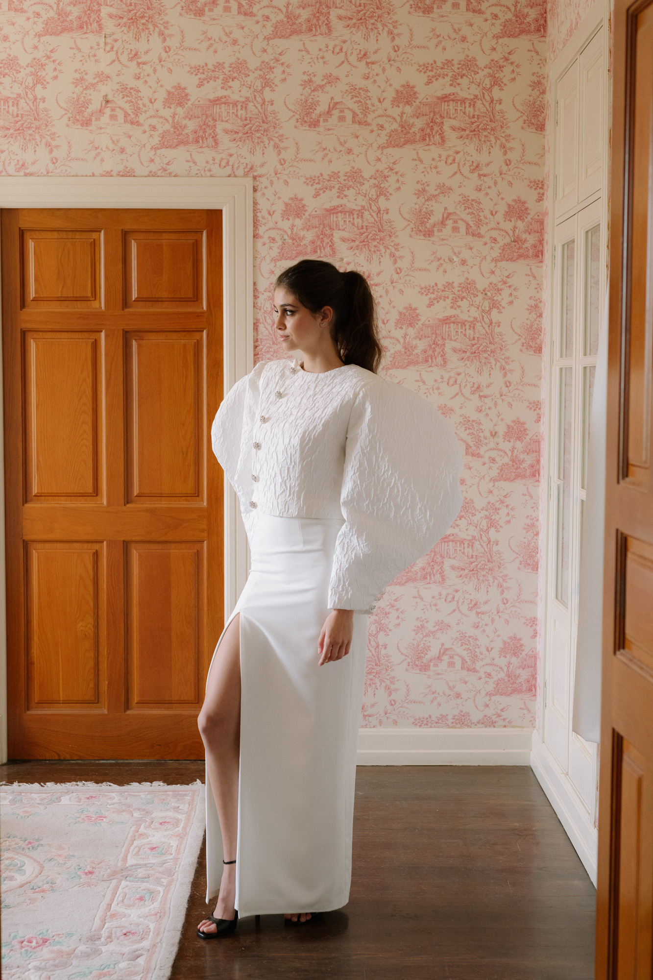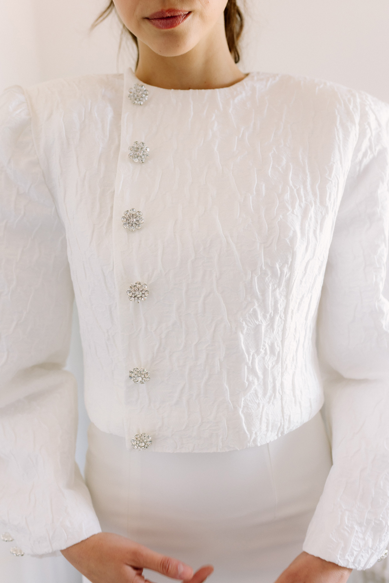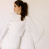 Una chaqueta de líneas curvas y marcadas define una nueva identidad y el inicio de una etapa de compromiso, en contraste con la serenidad de una falda de líneas puras. Los botones joya frontales evocan la sucesión de promesas en el tiempo.