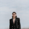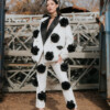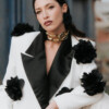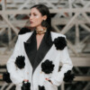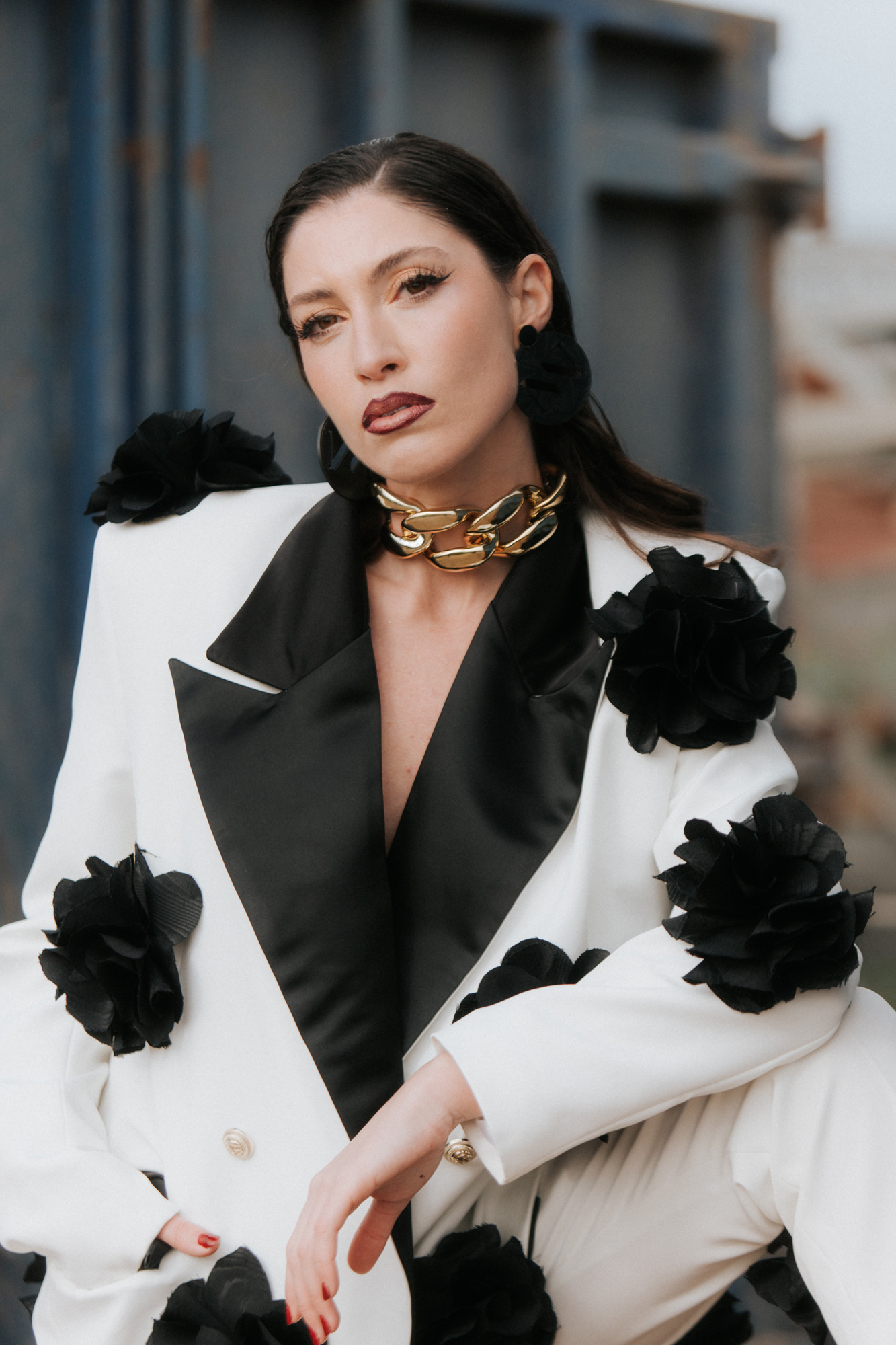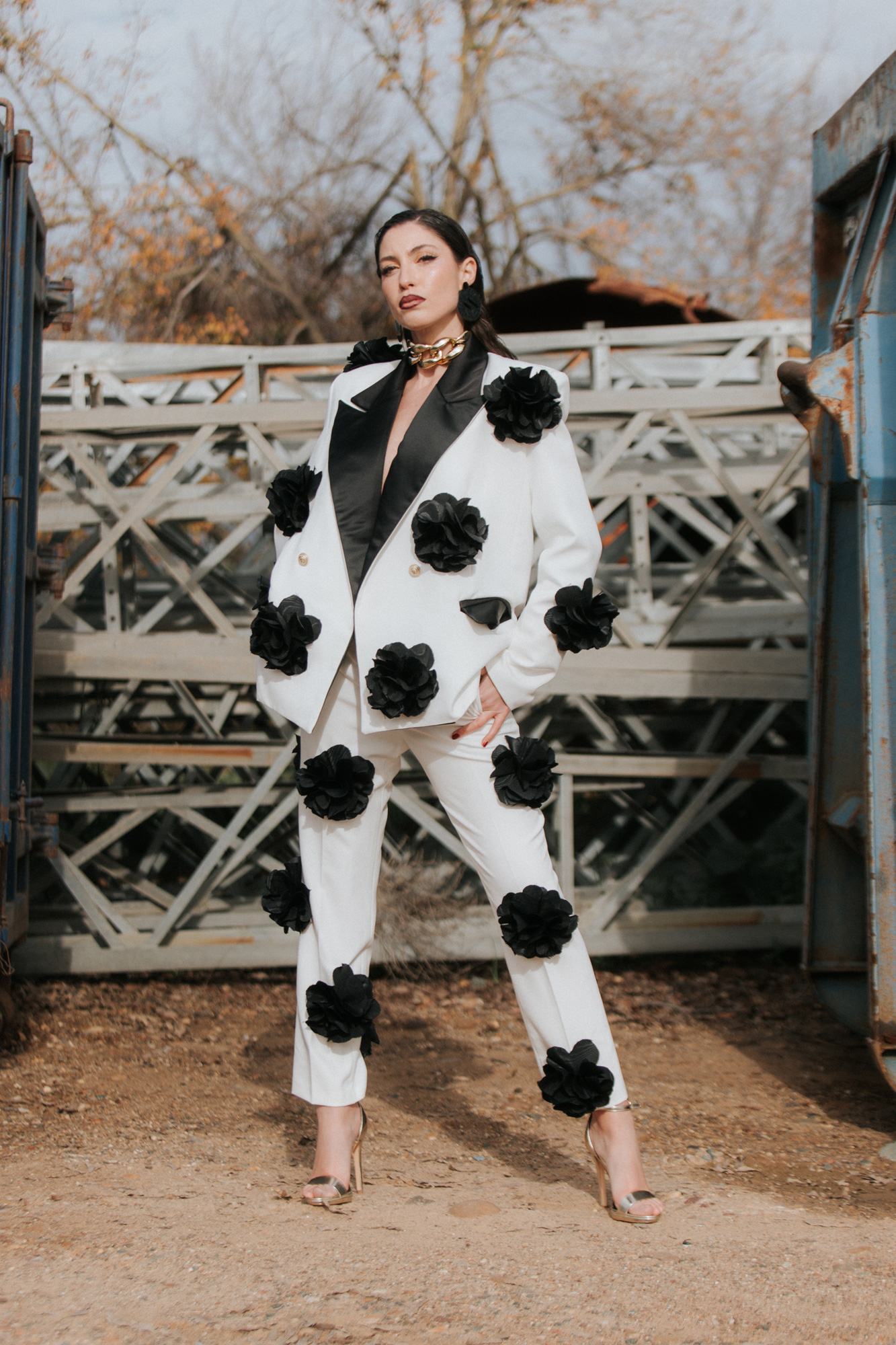 Traje chaqueta dos piezas realizado en crepe con flores 3d de tafetán.
