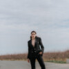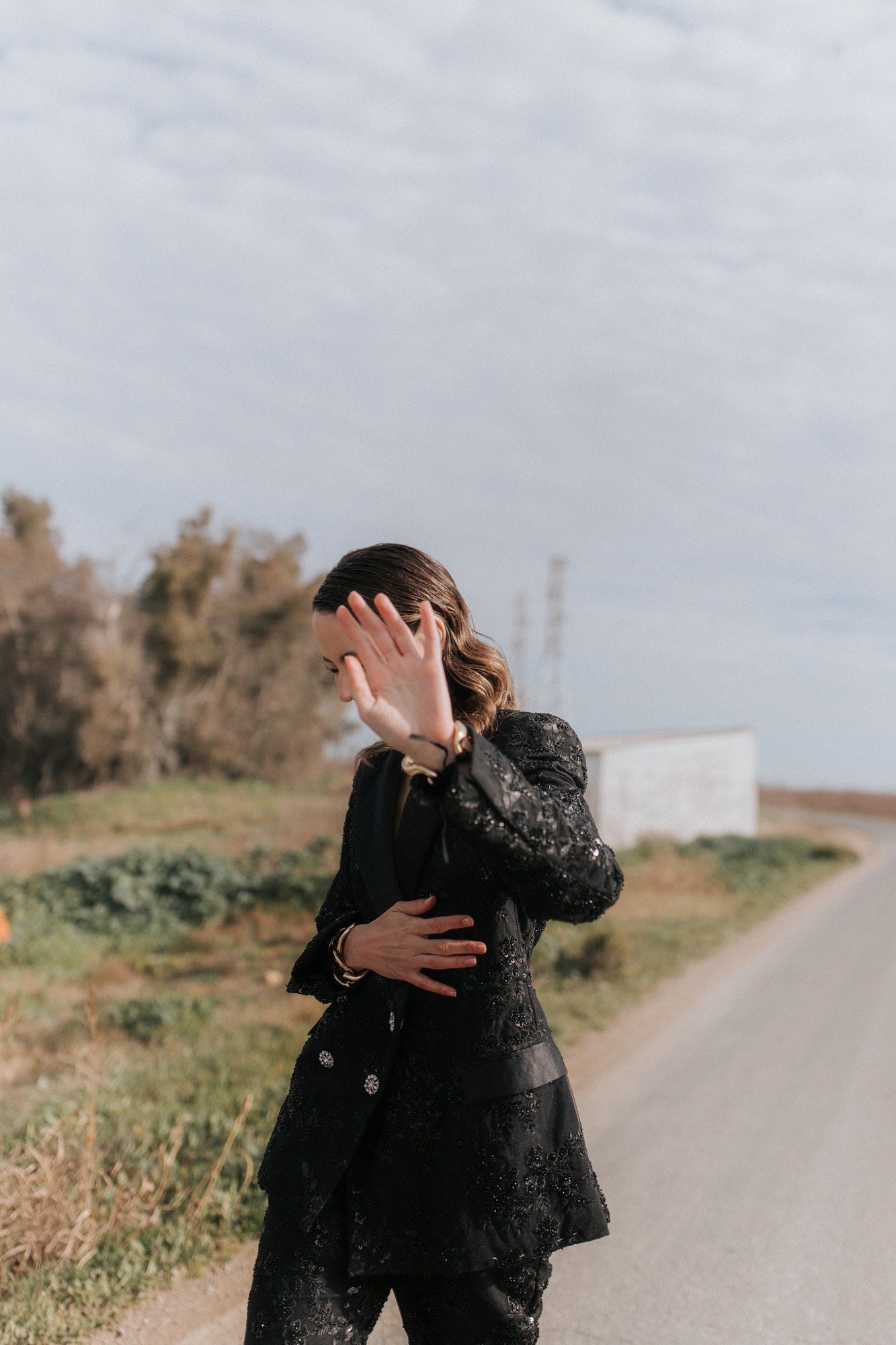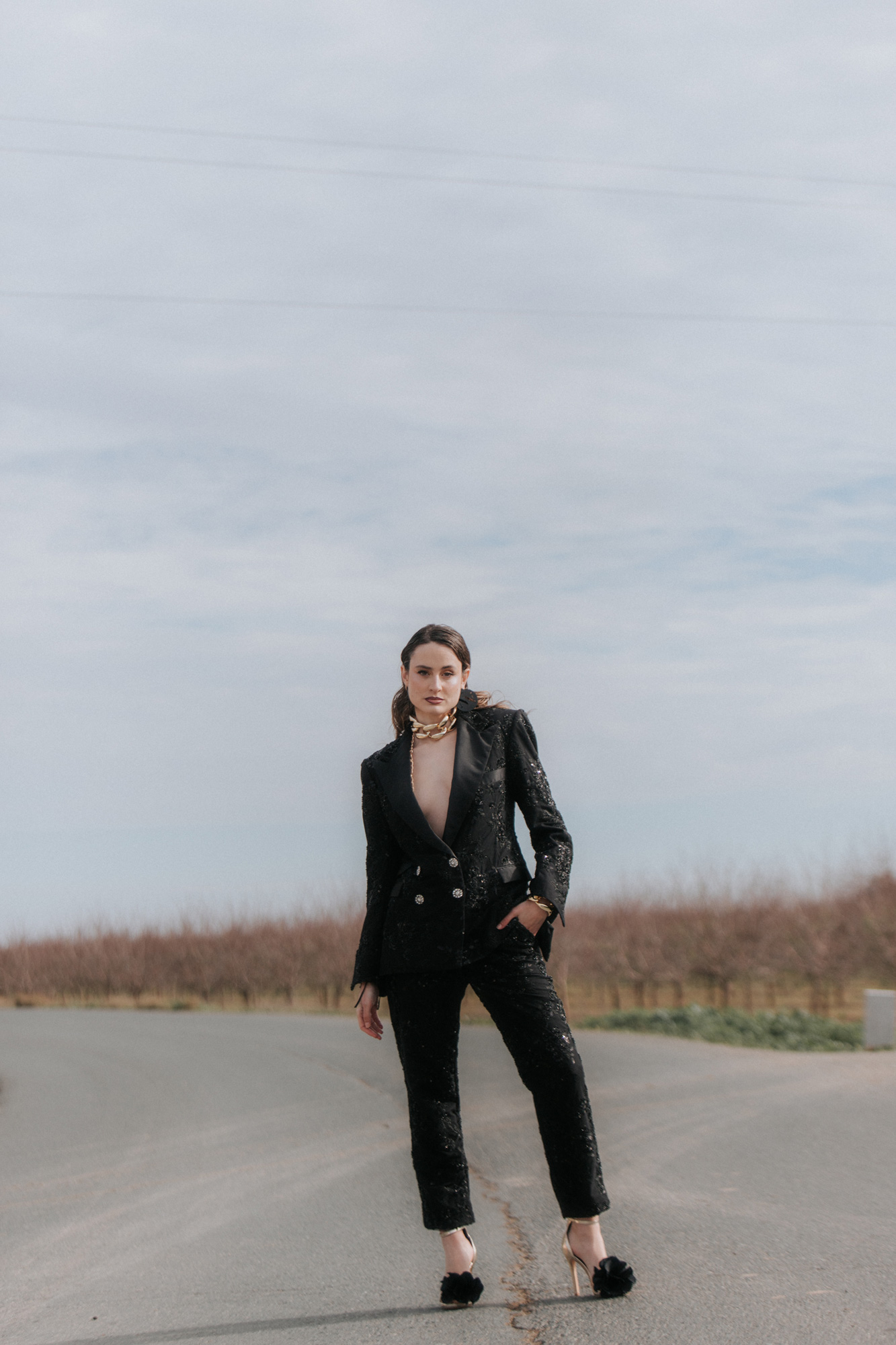 Traje chaqueta dos piezas realizado con pedrería artesanal, solapa de raso y hombreras XL.