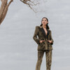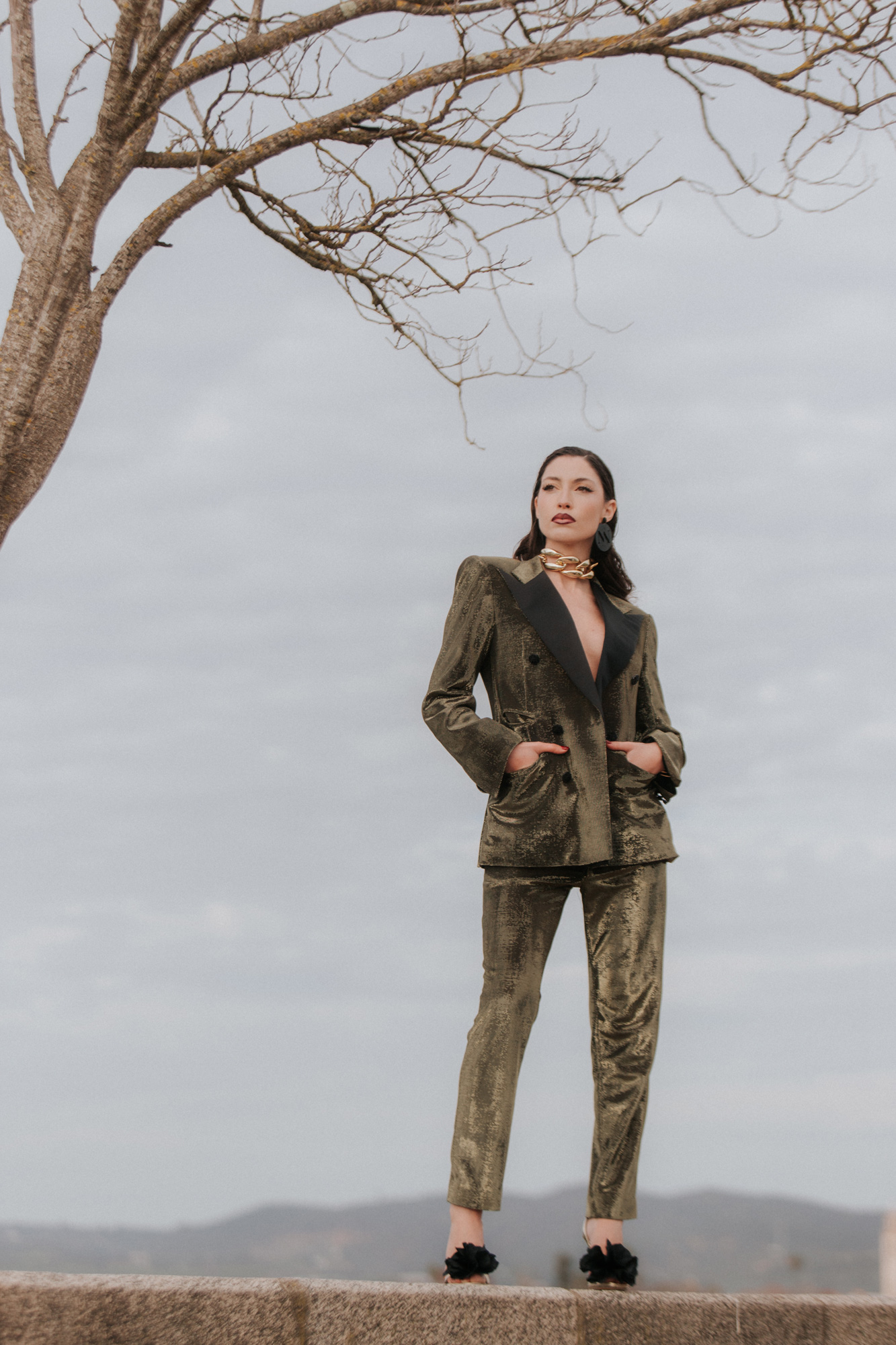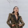 Traje chaqueta dos piezas realizado en tejido de brillo con solapa en raso liso. Color dorado.