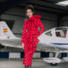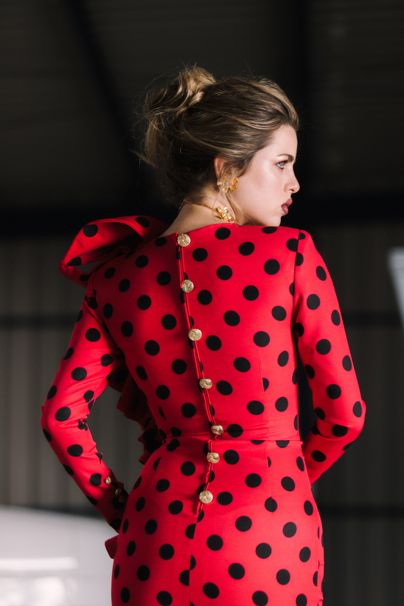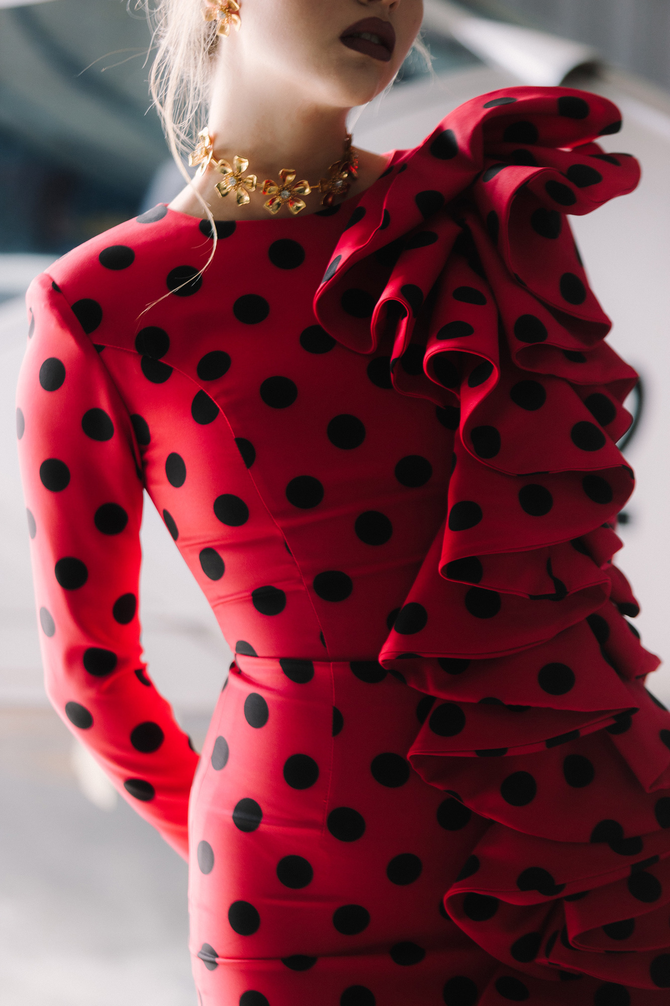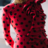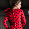 Vestido rojo midi con lunares negro midi y volantes.