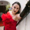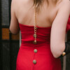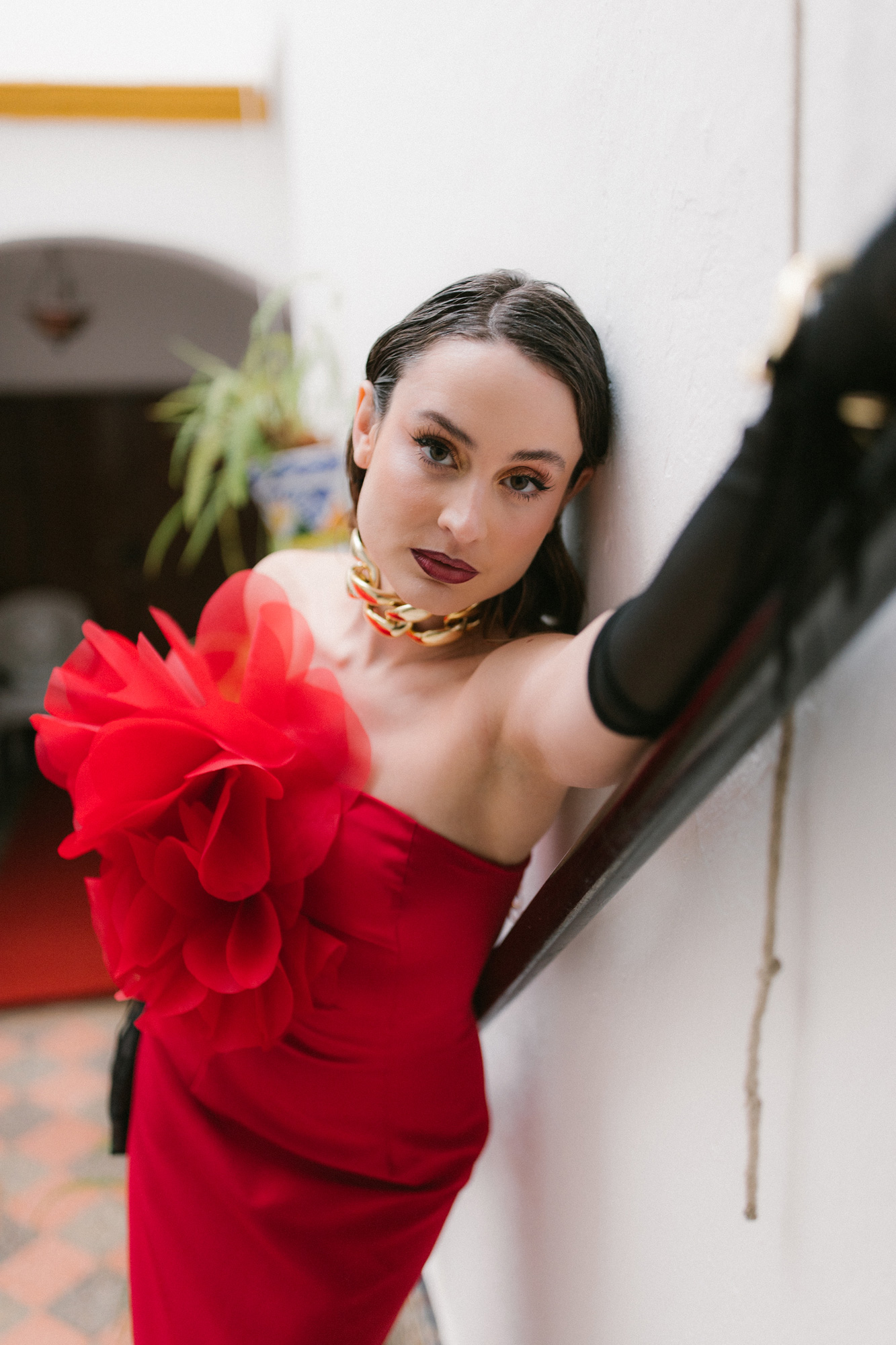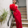Vestido palabra de honor con detalle de maxi flor en organza.